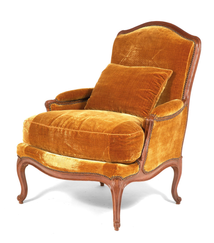 The Louis XV bergère “à la reine” (pictured below). The club chair of the 18th century. This is perhaps the most superb example of a simple, plain moulded model that I have found, made by the same master as the chaise above. These should be upholstered the same as described for the previous two chairs, but with the addition of a down and feather loose seat cushion. As with other chairs of the period, silk damask was a common covering, but silk velvet, silk and cotton blend velvet, and velours d’Utrecht (goat hair and linen blend velvet, very tough) were also used. And as usual, I think these can be very nice with plain linen for a simple, earthy aesthetic. Judging by the patina and the seams that are visible, indicating a narrow width fabric, this one is probably covered in a pure silk velvet.