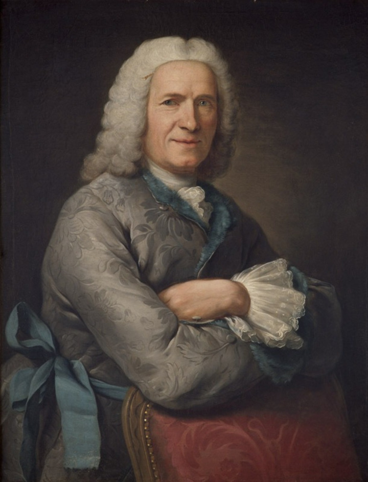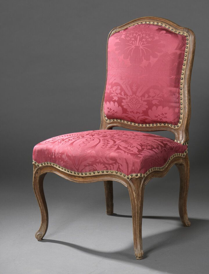 The Louis XV chaise “à la reine” (pictured below). This is one of my favorite examples, made by one of the masters, and a very simple plain moulded model. These make an elegant and comfortable dining chair. They are upholstered the same as described above. Here you also see an example of the wider spaced brass nails over braid, as I describe above and as is also shown in the painting below. The Paris ébénistes most often made these chairs in beech wood, but in Lyon they would often use walnut, and it could be very interesting to do reproductions of these chairs in walnut, especially if you want something more like the color of the old beech wood shown here. On this one, the platforms underneath the volutes on the feet are mostly worn away (that can happen over three centuries), causing a slight imbalance in its look.