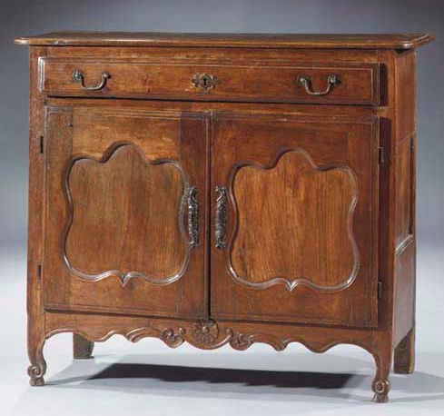 A wonderful 18th century French provincial buffet. I like the elegant and simple form, with interesting shaped framing but no carving on the doors, and just a bit of carved decoration on the bottom rail. |