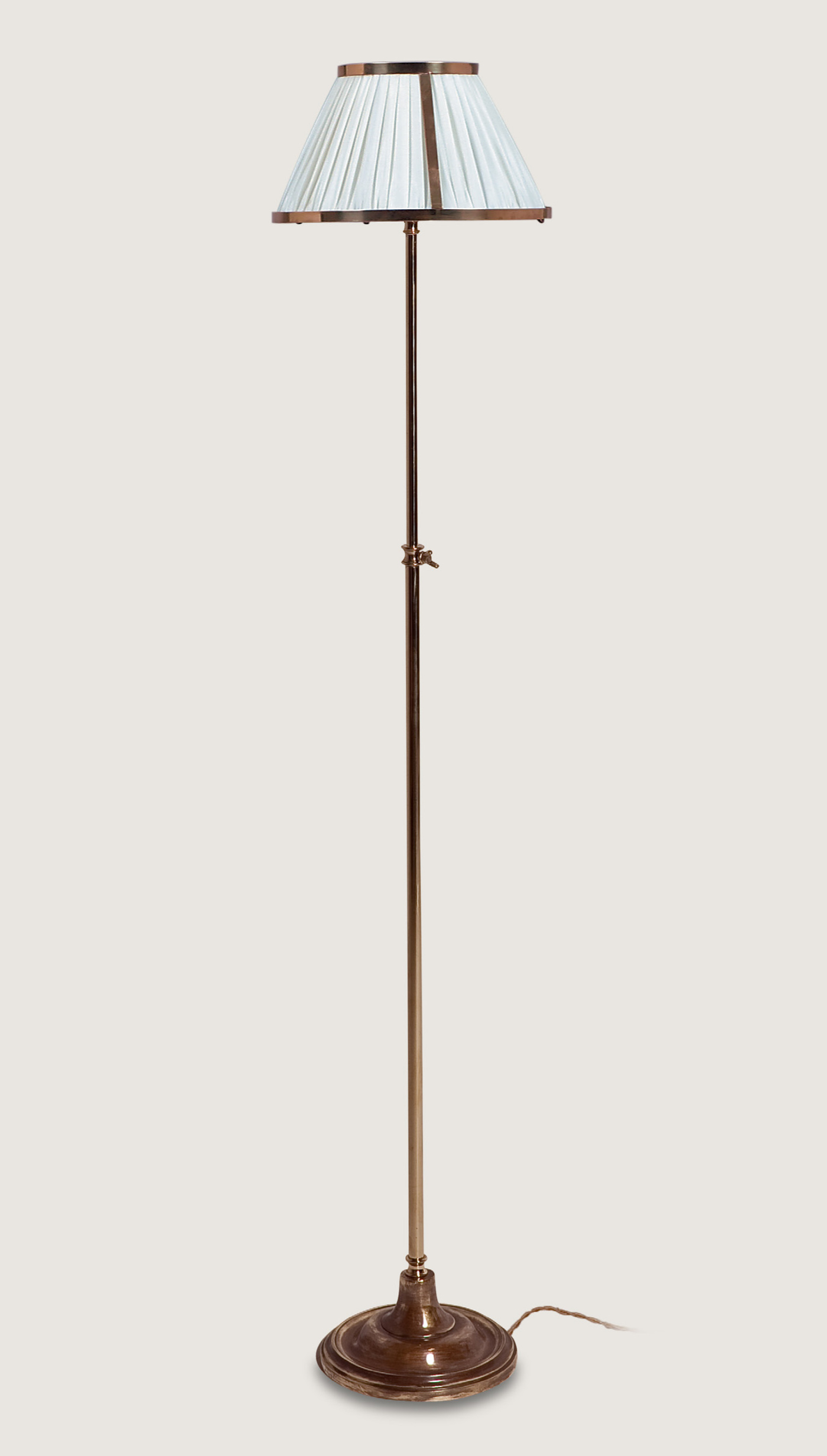 A classic floor lamp of adjustable height. The shade can be made without the metal strapping, if desired. Swing-arm floor lamps are also an option, but I often find the straight floor lamp to be preferable. |