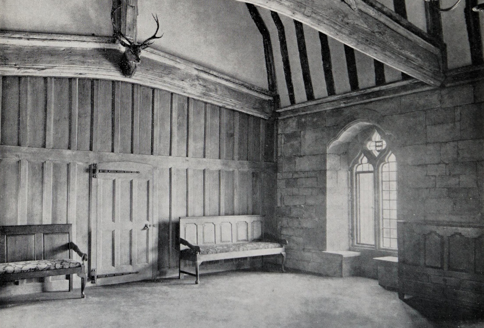 Another example of a timber-framed case piece (see above). This is a cupboard with three doors and two drawers, carved in relief with Gothic motifs of tracery and rosettes, flowers and fruit. This is a real 15th century piece, photographed in 1924. |