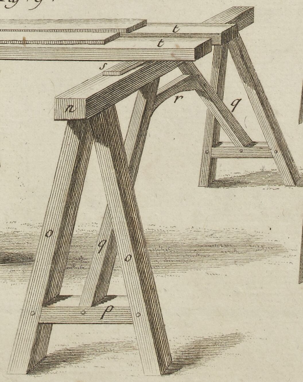 A nice trestle that could be made for use in the Medieval tradition of a table with loose plank set atop trestles. Originally illustrated in Roubo’s L’art du menuisier for use in the preparation of timber, it was taller than a man, but we would of course scale it down for a table. |