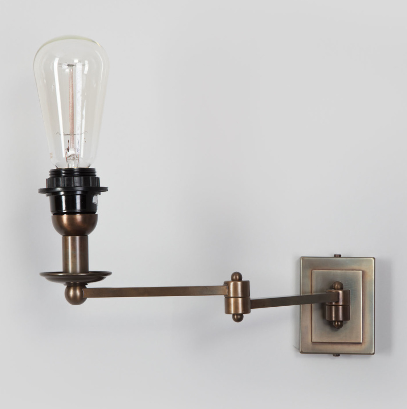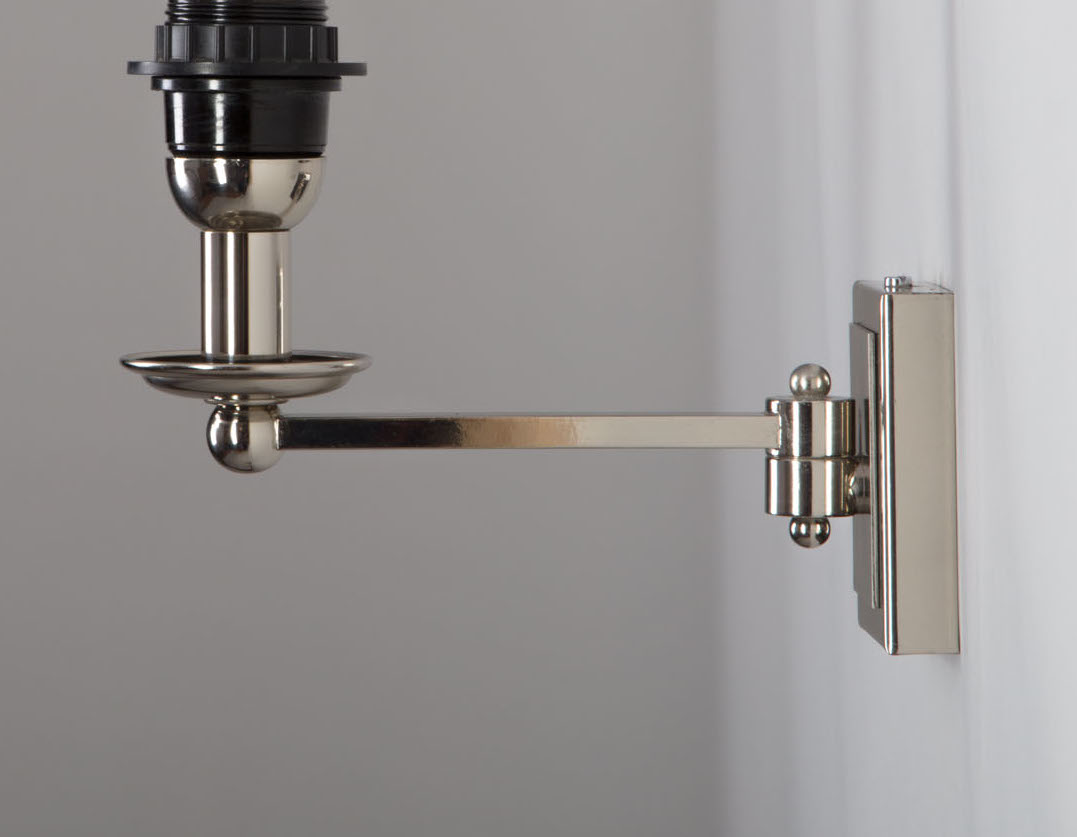 The same simple swing-arm wall light as above, but with a single arm for a lower-profile installation. Shown with nickel plating, but I would usually use brass. Shown without, but of course it would be used with a lampshade. |