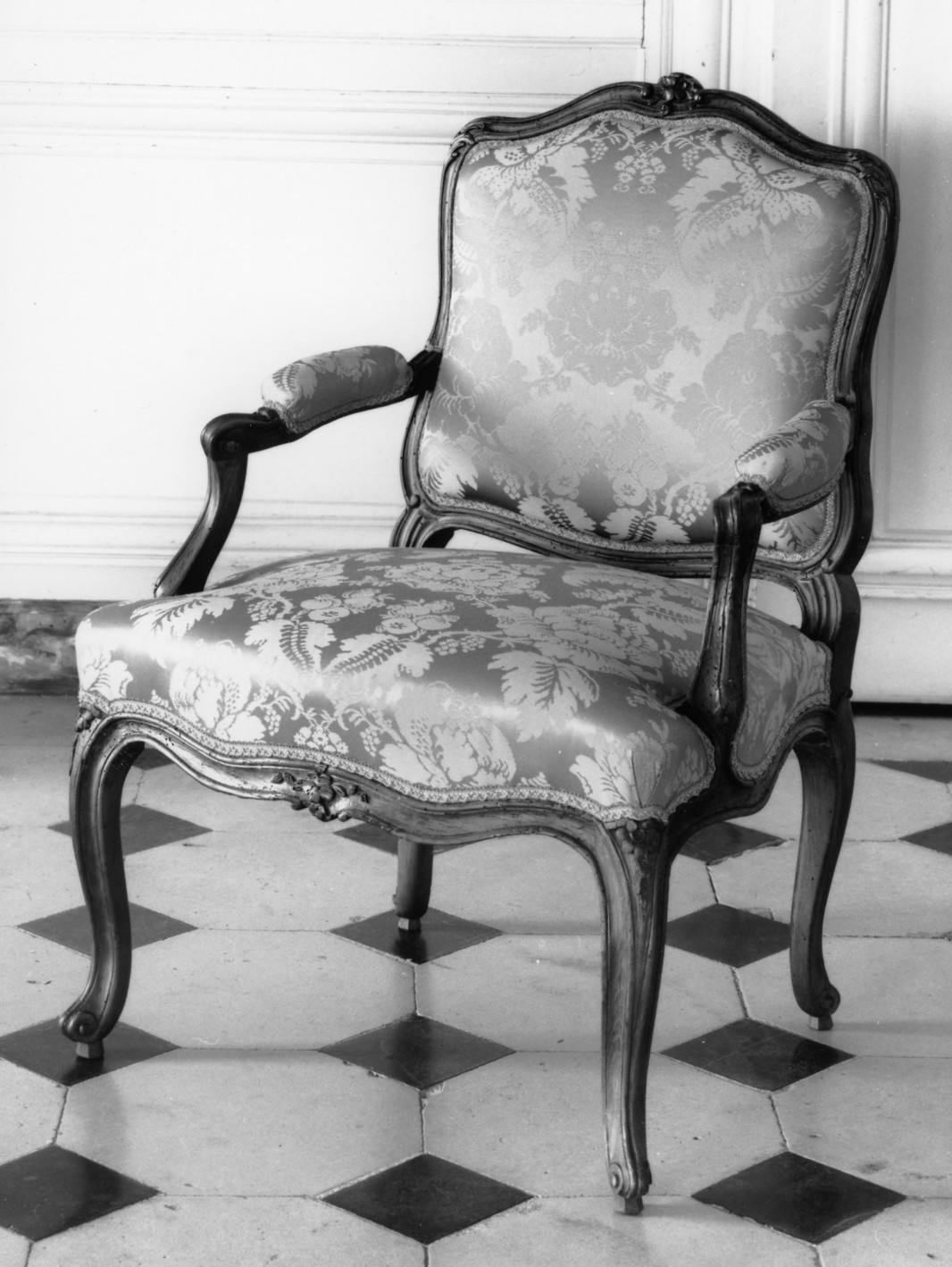 The Louis XV chaise “à la reine” (pictured below). This is one of my favorite examples, made by one of the masters, and a very simple plain moulded model. These make an elegant and comfortable dining chair. They are upholstered the same as described above. Here you also see an example of the wider spaced brass nails over braid, as I describe above and as is also shown in the painting below. The Paris ébénistes most often made these chairs in beech wood, but in Lyon they would often use walnut, and it could be very interesting to do reproductions of these chairs in walnut, especially if you want something more like the color of the old beech wood shown here. On this one, the platforms underneath the volutes on the feet are mostly worn away (that can happen over three centuries), causing a slight imbalance in its look.