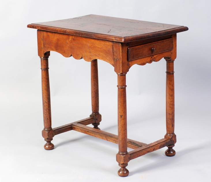 The classic Louis XIII table, a strong form that I particularly like. Legs and stretchers turned “en spirale”. Good as a side table, writing table, or library table. The placement and choice of hardware for the pulls can change its appearance, and is a good way to add some desired character. |